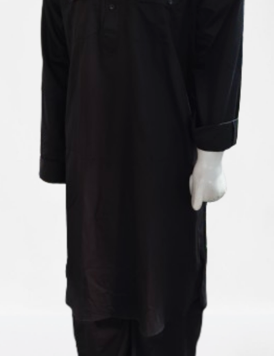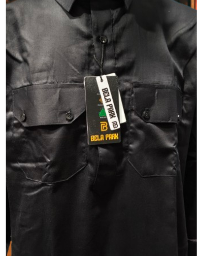 Make a bold style statement with this Black Pathani Kurta Pajama Set crafted from luxurious Giza cotton fabric. Designed for elegance and comfort, the kurta features flap pockets on the chest, a half-button placket, and a collared neckline that gives a refined touch to your ethnic look. Paired with matching pajama, this set is perfect for festive occasions, weddings, parties, or casual traditional wear. The premium Giza cotton ensures breathability, smooth texture, and long-lasting comfort.