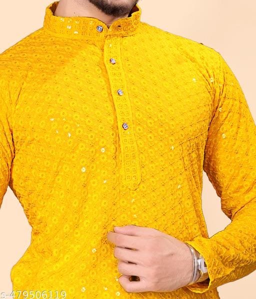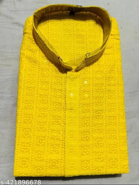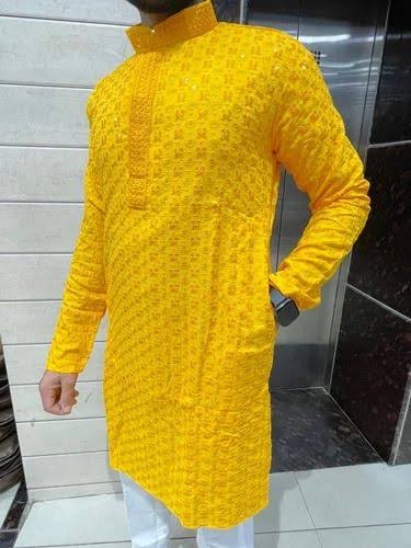 This bright yellow sequence kurta is specially designed for Haldi functions and festive occasions. Made from soft rayon fabric, it ensures comfort with a rich ethnic style. The fine sequence work adds a festive shine, making it an ideal outfit for weddings, parties, and traditional celebrations. Pair it with white pajama or churidar to complete the elegant look.