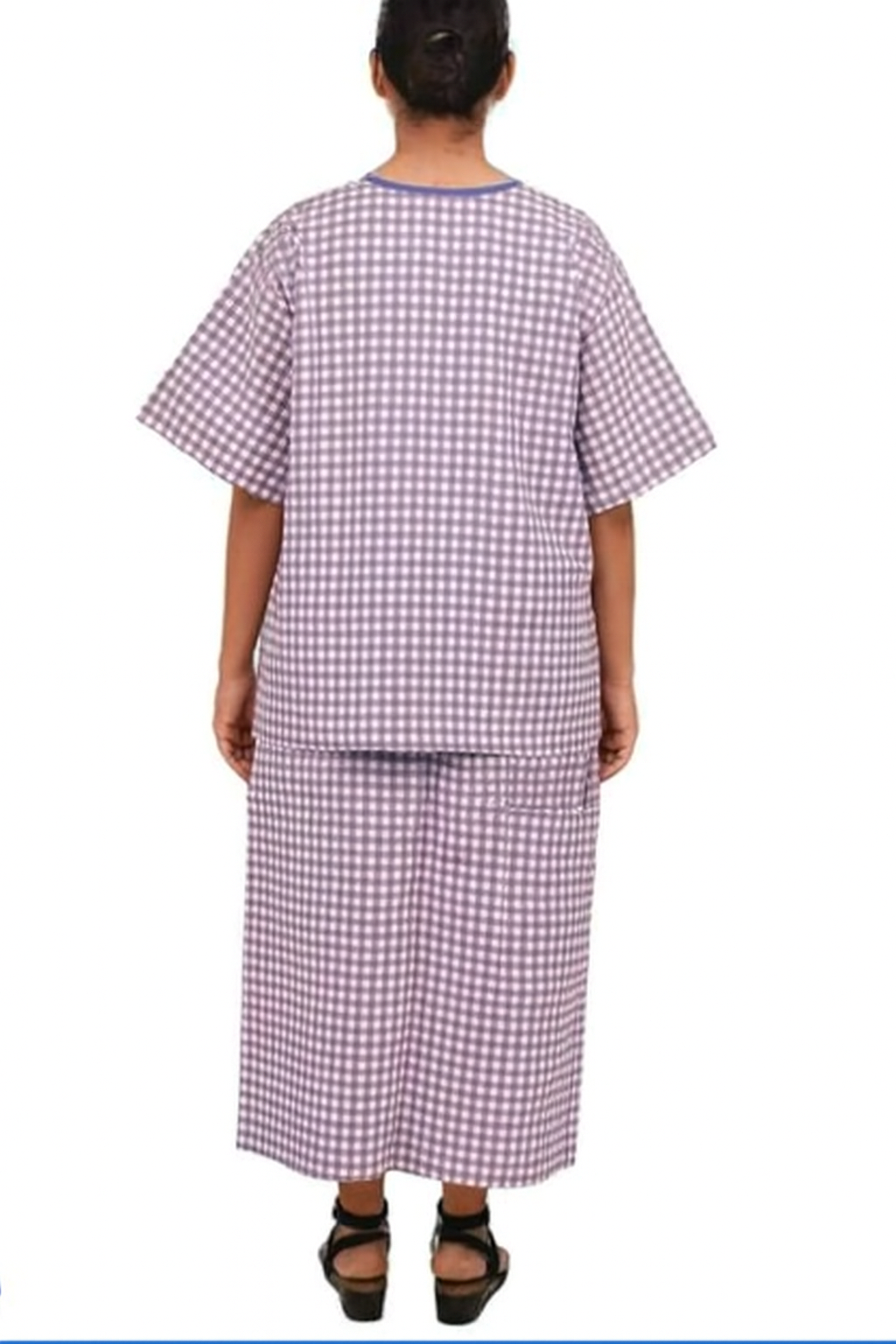 The relaxed fit design with half sleeves allows unrestricted movement, making it practical for patients. Featuring a classic check print, front pocket for essentials, and knee-length coverage, this hospital gown balances comfort with modesty. Its lightweight, easy-to-wash fabric ensures hygiene and durability, making it ideal for both hospital and home care use.