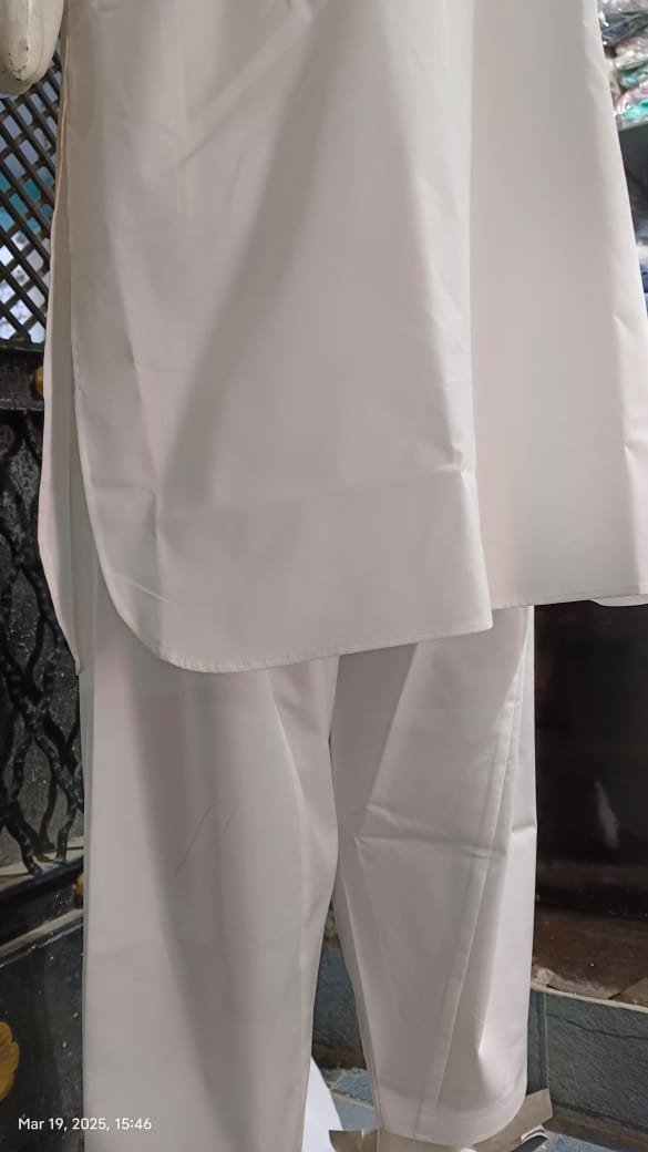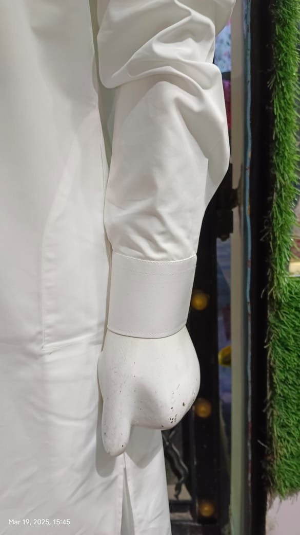 White Pathani Kurta & Payjama set, designed in premium Giza cotton for a soft, breathable, and luxurious feel. The kurta features a prince-style collar with intricate embroidery on the neckline and tabija, giving it a refined and regal appeal.