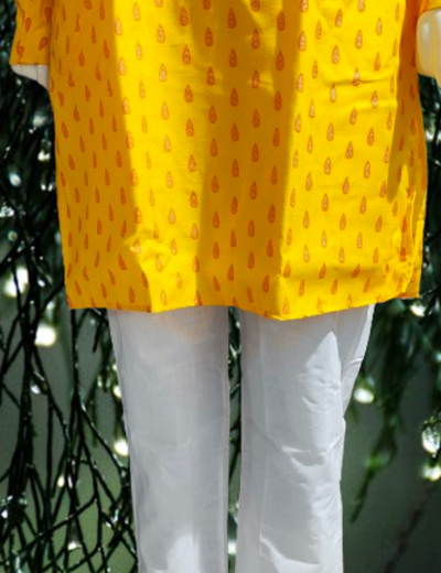 The bright yellow shade is enhanced with an all-over subtle printed motif design, giving it a festive yet elegant look. Featuring a mandarin collar, button placket, and full sleeves, this kurta reflects traditional Indian styling with a modern touch. Pair it with white pajama, churidar, or denim for a complete ethnic or Indo-fusion look.
